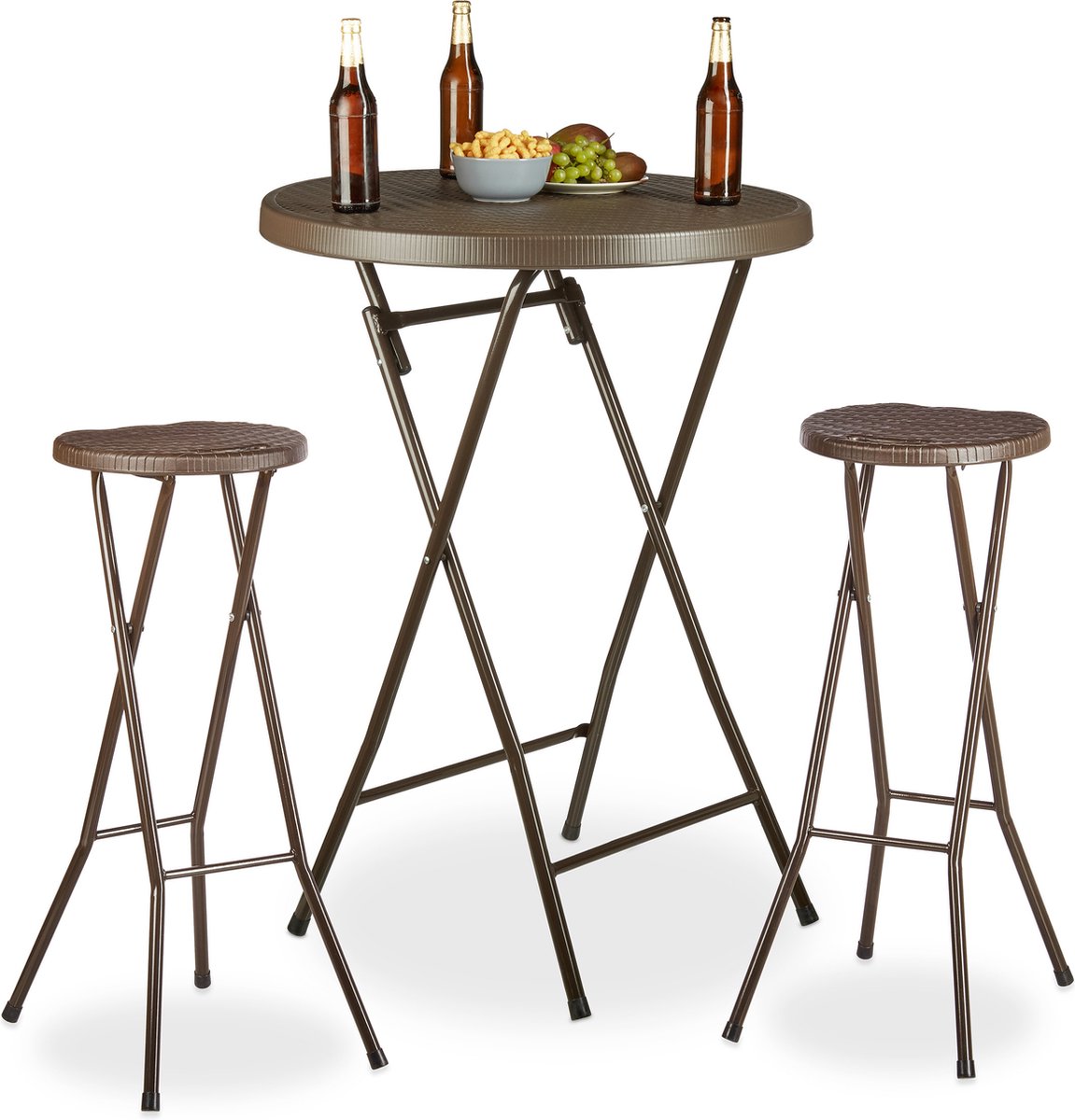 Deze Relaxdays 3-delige statafel set met krukken is de perfecte aanvulling voor de tuin, het balkon of de camping. De tafel is gemaakt van stevig, weerbestendig kunststof en heeft een metalen onderstel. De twee krukken kunnen gemakkelijk worden ingeklapt en kunnen ook dienen als barkrukken. De tafel is verstelbaar waardoor de hoogte kan worden aangepast aan de behoefte. De statafel set is perfect voor het houden van kleine feestjes of het organiseren van een familiediner in de tuin. De tafel heeft een aantrekkelijke rotan look en is eenvoudig schoon te maken. De statafel set is inklapbaar en ruimtebesparend en kan gemakkelijk worden opgeborgen na gebruik. Perfect voor mensen met beperkte ruimte. De set is een geweldige investering voor al uw buitenactiviteiten.