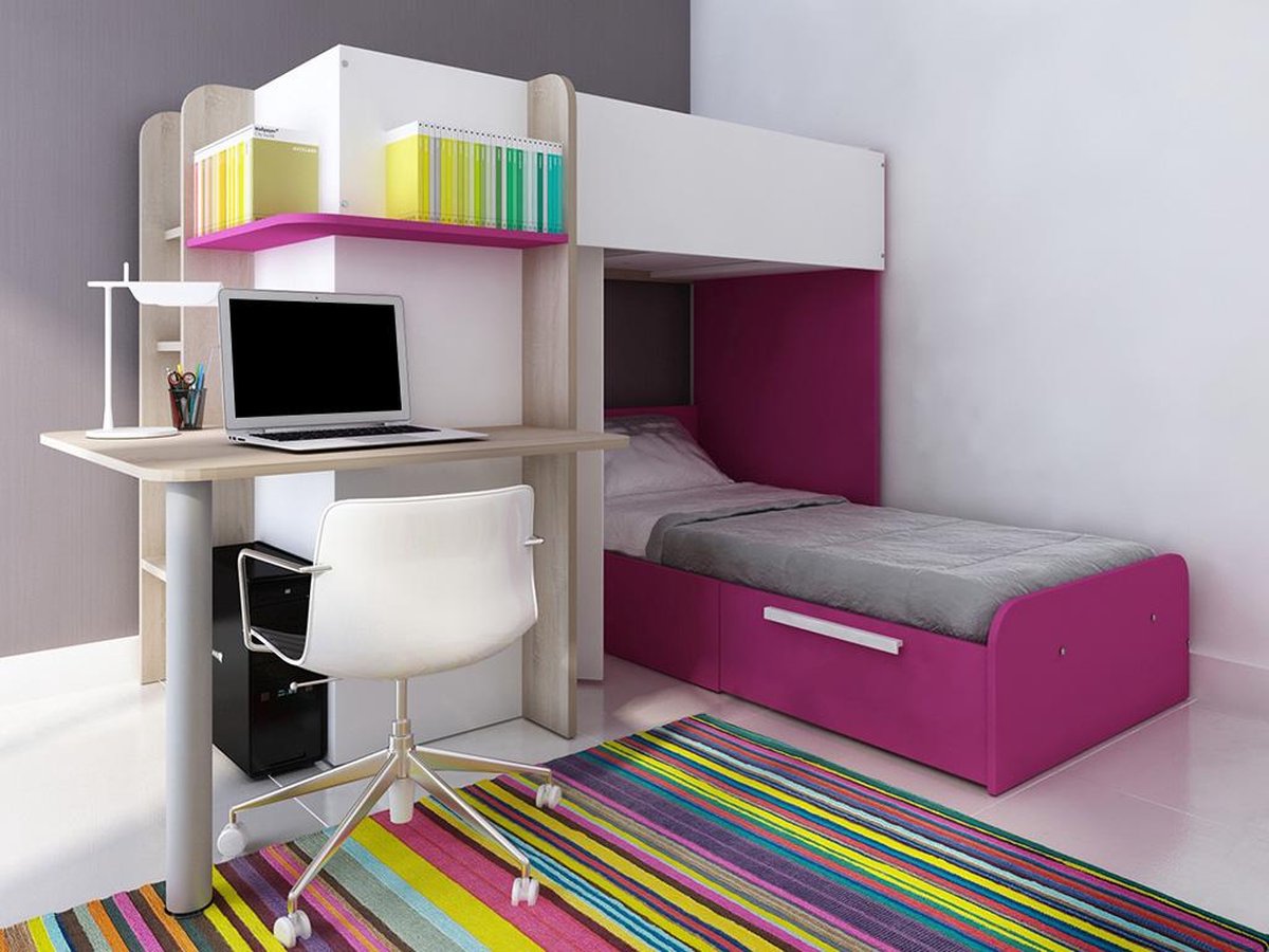 Dit stapelbed SAMUEL biedt genoeg ruimte voor twee kinderen om lekker te slapen. Met een afmeting van 90 x 190 cm is het perfect voor kamers met een kleiner formaat. Met zijn ingebouwde bureau is dit bed praktisch en stijlvol tegelijk. Het bureau is afgewerkt met een grenen bovenblad en een roze onderblad. Daarnaast is er nog een lade die een extra ruimte creëert waar je kleine spullen in kunt opbergen, en een nachtkastje waar je boeken, lampen of andere spullen in kunt opbergen. Met een afmeting van 241 cm in de lengte, 160.1 cm in de hoogte en 194 cm in de breedte biedt dit stapelbed veel ruimte om alle spulletjes van je kinderen mooi en georganiseerd op te bergen.
